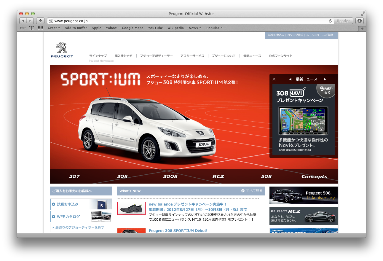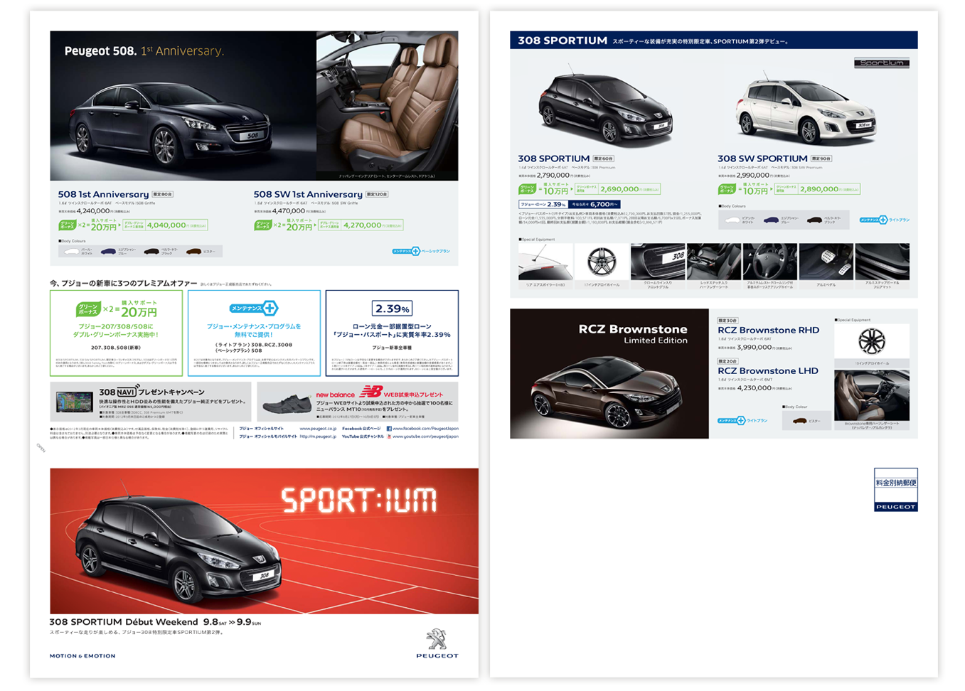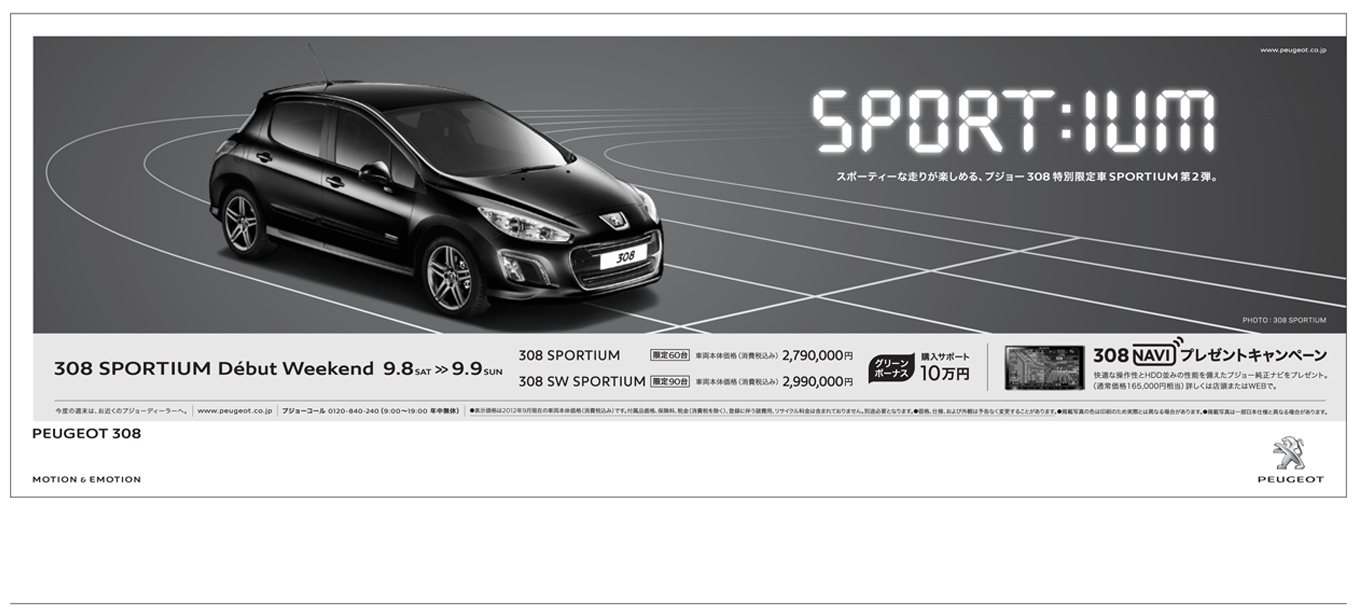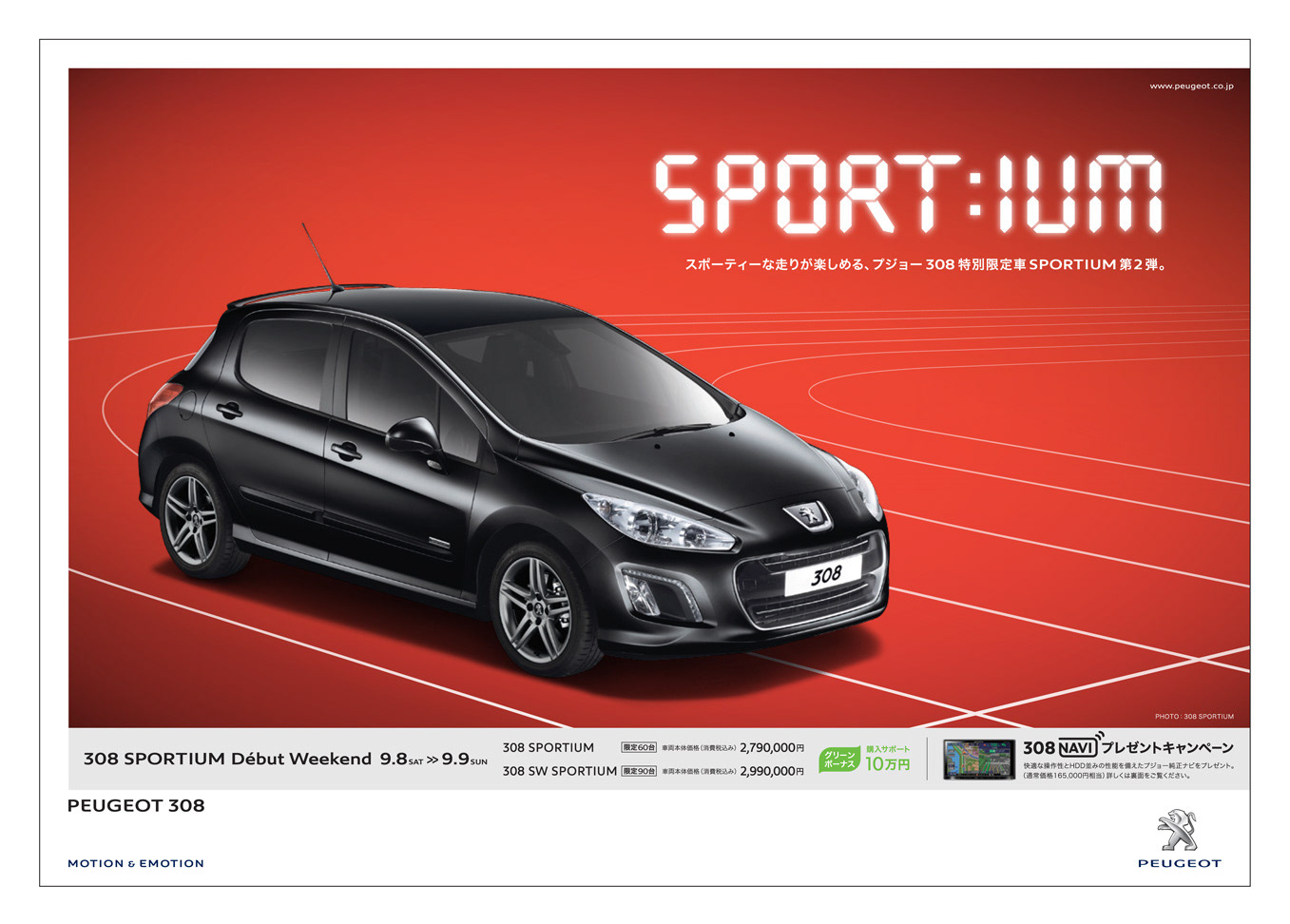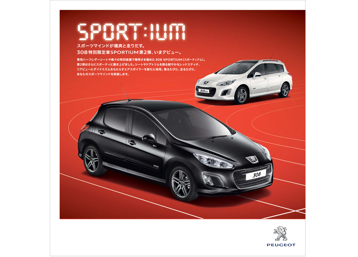 Client Objective/Challenge In my time at I&S BDDO/Proximity I was responsible for creative direction of the monthly promotional kits for both Peugeot and Citroen auto brands. I was directly involved in creative direction, overseeing the successful implementation of the BTL promotional materials driving customer traffic to dealerships throughout Japan. In all cases however much of the format was already decided by global direction, however in the début of the 308 Sportium I turned what was otherwise a limitation into a visually beneficial feature. With car artwork limited and wheels never be blurred or made difficult to recognise I had to ensure that a stationary car must appear sporty. Creative Solution My approach made sure that while the car didn't move the rest of the art did, imbuing sportiness and dynamism in auto performance. The inclusion of a red/orange athletic track provided the injection of movement and energy and foregoing the traditional white car I chose a black model and accompanied it with a highly recognisable digital timer-based set of glyphs split to emphasise the sport in 'Sport-ium'. Results With reduced creative flexibility and no increase in production of direct mail to online landing page I still increased site visit rates by +12% for this campaign.