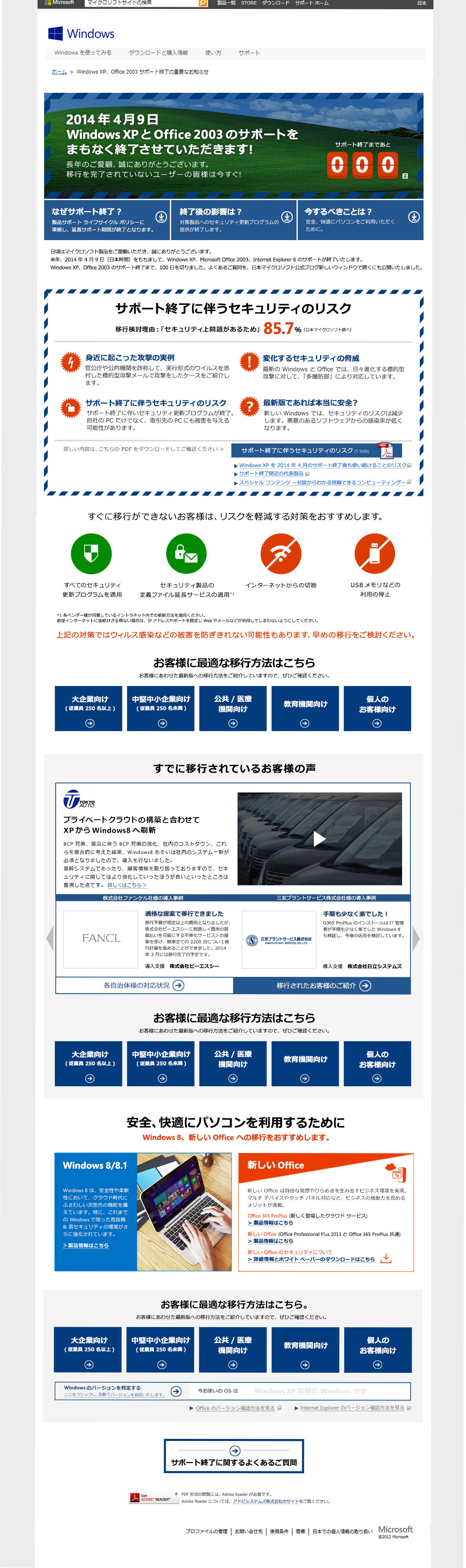 http://www.microsoft.com/ja-jp/windows/lifecycle/xp_eos.aspx?WT.mc_id=13_cm_wi_eos_ Client Objective/Challenge Microsoft operates a maximum of 10 years support for its products and operating systems, but due to the success of the Windows XP operating system and Office 2003 a further two years of support was implemented as a security net for those still needing to migrate to newer software. The 4th April 2014 marked the end of the extension period and Microsoft was faced with a race to successfully communicate to its users that they needed to initiate a migration plan as soon as possible. I art directed a 3-phase rollout of the communication beginning in April 2013 that targeting small and medium-sized businesses, an estimated 1.6 million companies in Japan, a significant sector for Microsoft’s products. Creative Solution Phase 1, a year in advance of the support expiry date, consisted of a soft awareness campaign due to the concern that Microsoft was leaving their customers “high and dry”, in order to capitalise from the subsequent software upgrade purchases, despite the declared expiration of the 10 year support. From October 2013 phase 2, drove a more specific message on potential security issues facing those who fail to act, based on findings that users’ had vested interests in XP-based business-critical speciality software; as well as a poor or mistaken understanding of unattended security weaknesses. Finally, phase 3 saw a much broader extension of the message into migration case studies as well as promotion of the next generation OS Office 365. Results Beginning in April 2012 results continued to show above estimated numbers of site visits, having met its target of 900,000 visits by June 2012. By the end of Phase 1 a survey revealed that message awareness increased from pre-campaign figures of 43% to 63%, while results in February of 2014 showed that awareness had further increased to 88.1%, promising a successful completion of a 90% awareness goal by April 2014. The site achieved 163% on its KPI of 3,000,000 views with a total of 4,910,000 views.